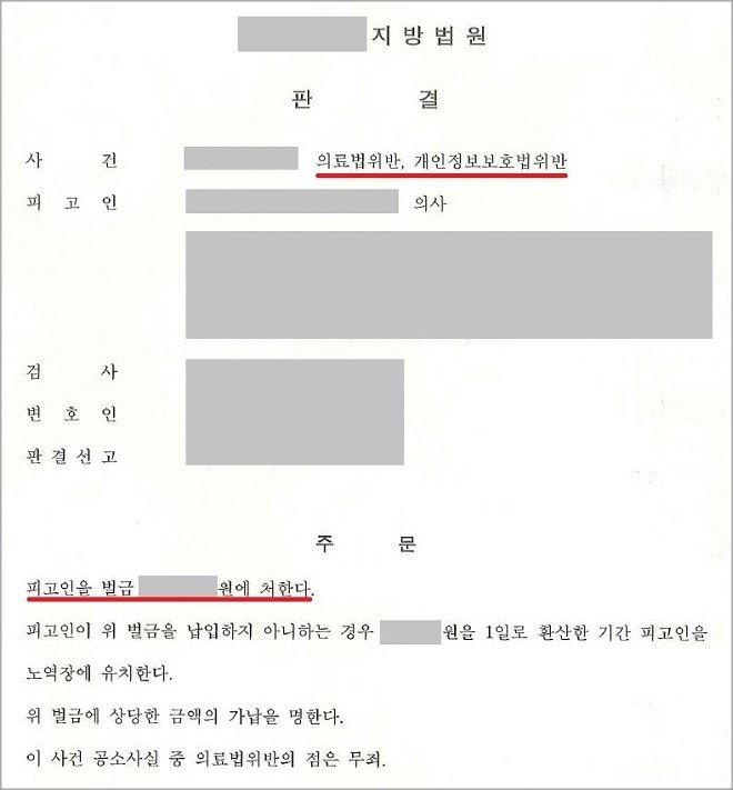 피고인이 B병원을 홍보하는 광고 문자메시지를 발송해 개인정보처리자로서 수집 목적 범위 외에 개인정보를 이용하였음이 인정되어, 개인정보보호법위반으로 벌금형의 유죄판결이 내려졌습니다. 다만 의료법 위반에 대해서는, 누출된 개인정보가 전자서명법에 따른 전자서명이 기재된 전자문서인 전자의무기록이라고 인정하기 어렵다는 이유로 무죄가 선고되었습니다.
